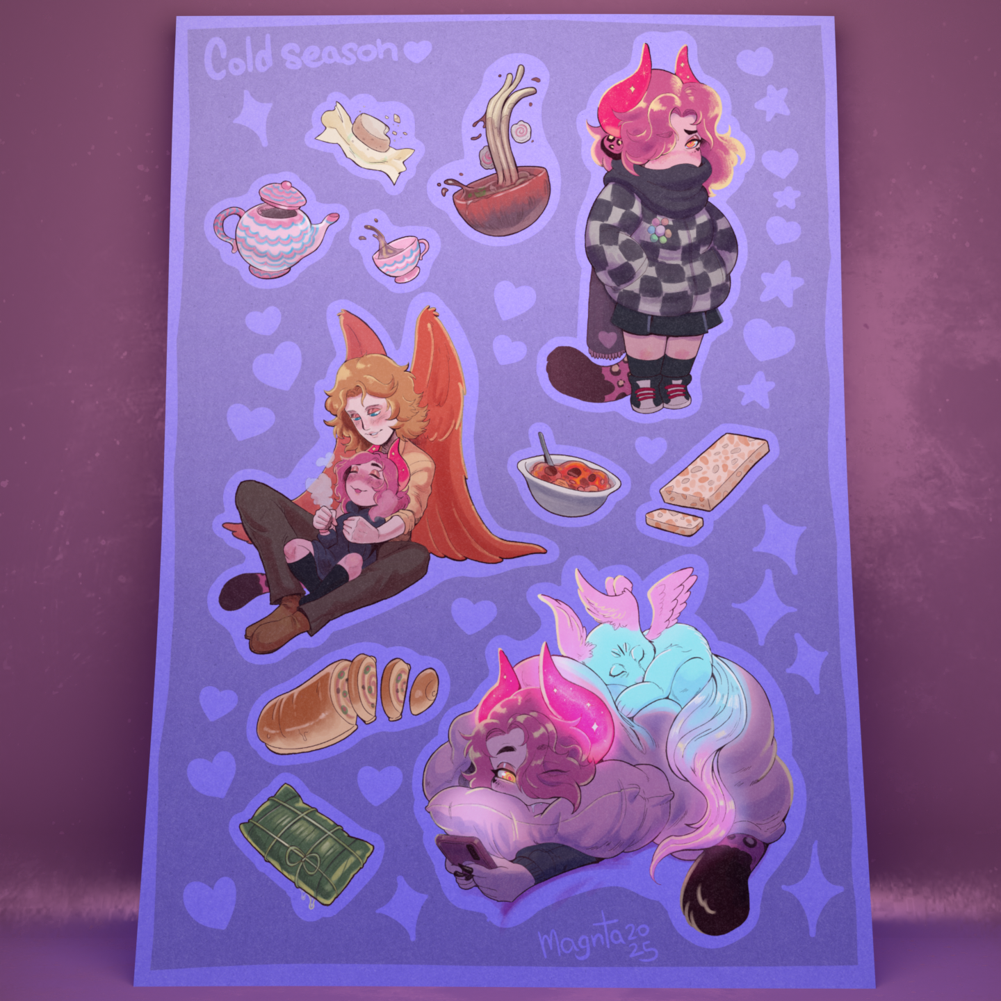The Cozy Demon Winter Sticker Sheet is here to wrap your journals, planners, and sketchbooks in pure comfort and sleepy seasonal magic. With warm foods, tired horns, steaming mugs, and characters bundled in blankets, it captures everything soft and sacred about the coldest monthsโwhen all you want is comfort and company.