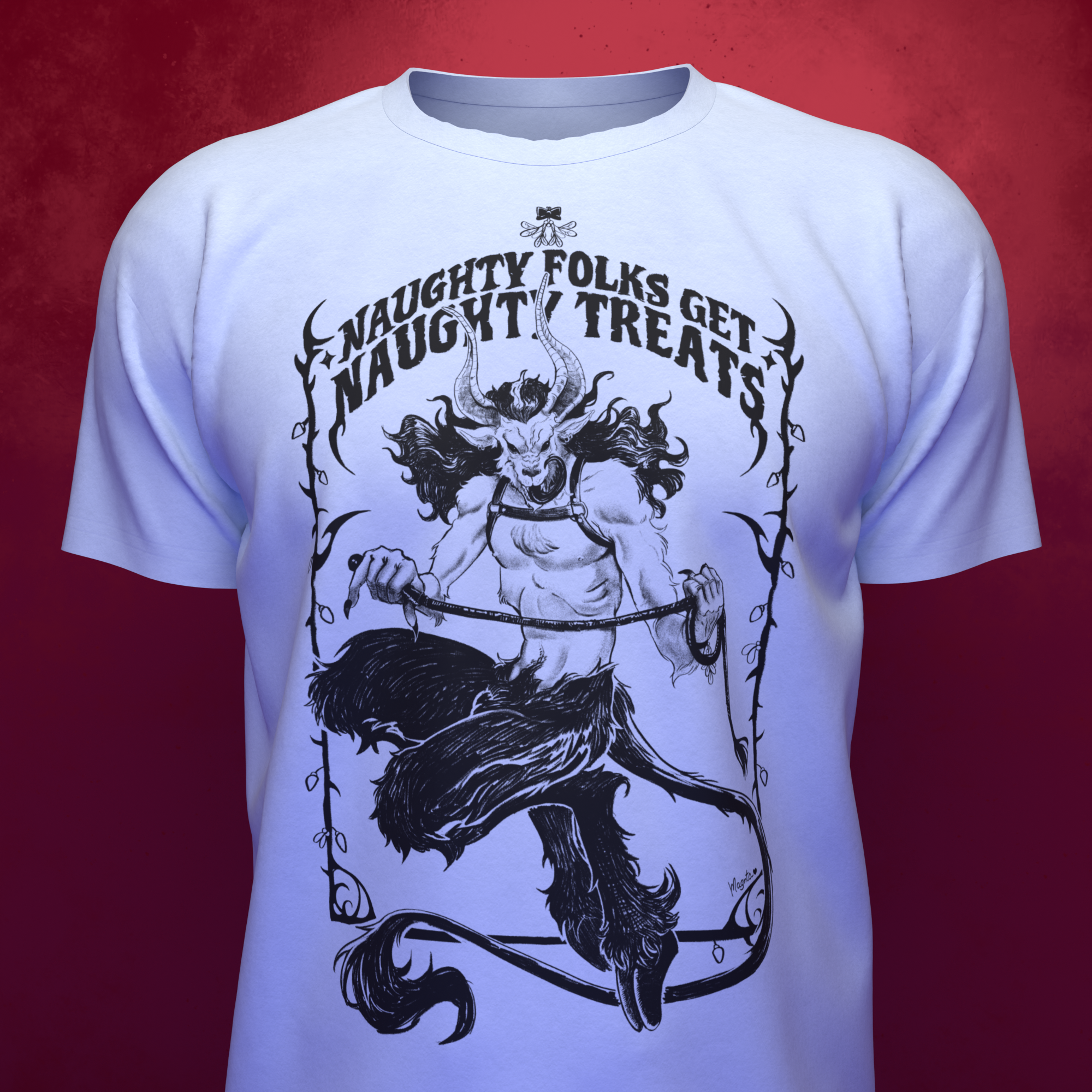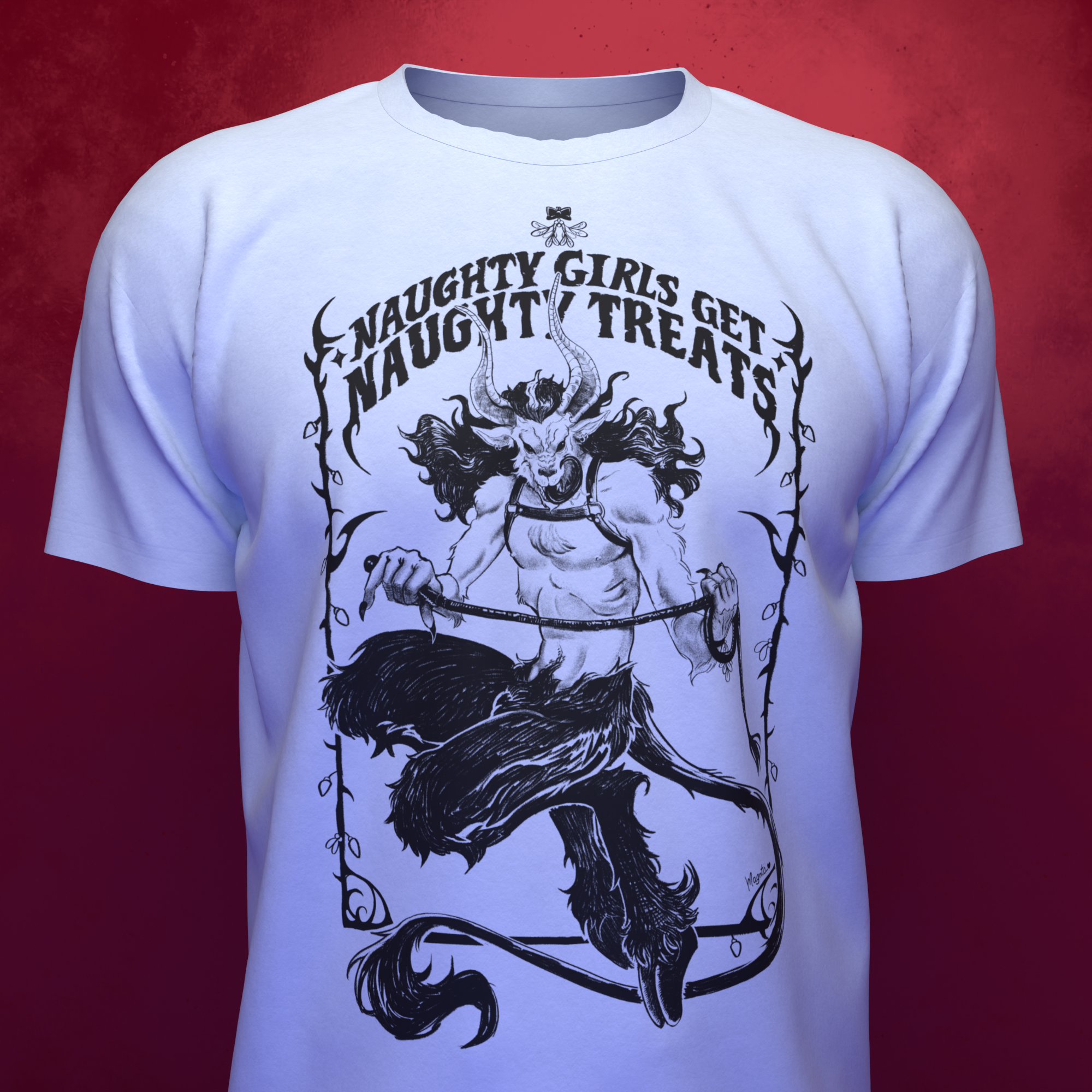 The Sexy Naughty Krampus T-shirt is here to haunt your holiday wardrobeโin the hottest way possible. Illustrated by Magenta, this cheeky seasonal design features a devilish, horned Krampus posed seductively with his whip, ready to deliver treats to the naughty only. With the gothic slogan โNaughty Boys Get Naughty Treatsโ splashed across the top, this tee is a bold and unapologetic take on winter celebrations.