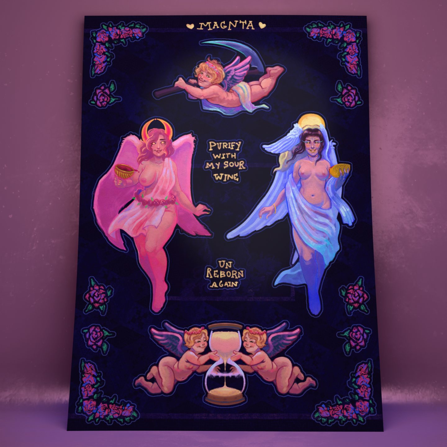 The Angelic Rebirth Aesthetic Sticker Sheet is a lush visual devotion to sin, sanctity, and transformation. Titled Sour Wine, this sheet features baroque-inspired cherubs, draped femme figures, gothic roses, and cryptic text that reads: โPurify with my sour wine or be reborn again.โ
