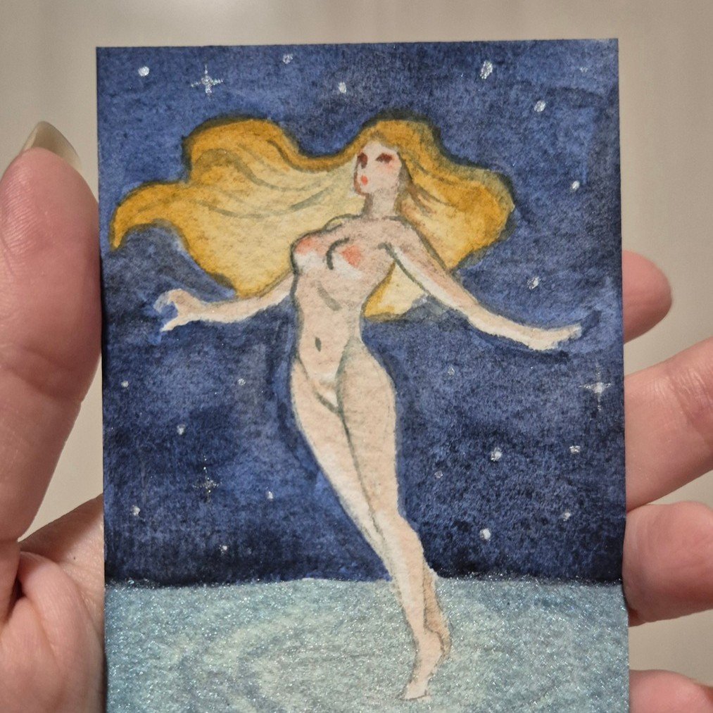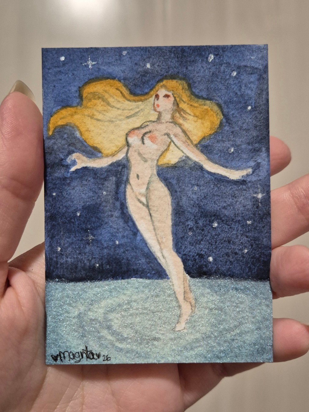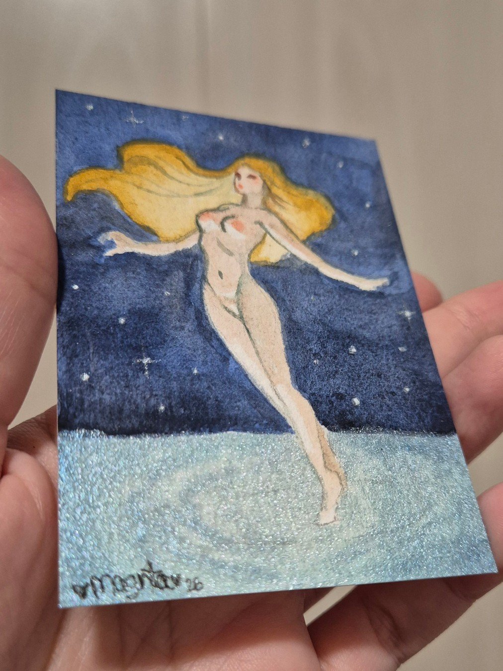 This original miniature painting is ideal for collectors of ACEO art, watercolor originals, fantasy artwork, and small traditional paintings. It works beautifully for anyone drawn to celestial imagery, ethereal figures, dreamlike scenes, or handmade miniature art with a quiet magical atmosphere.